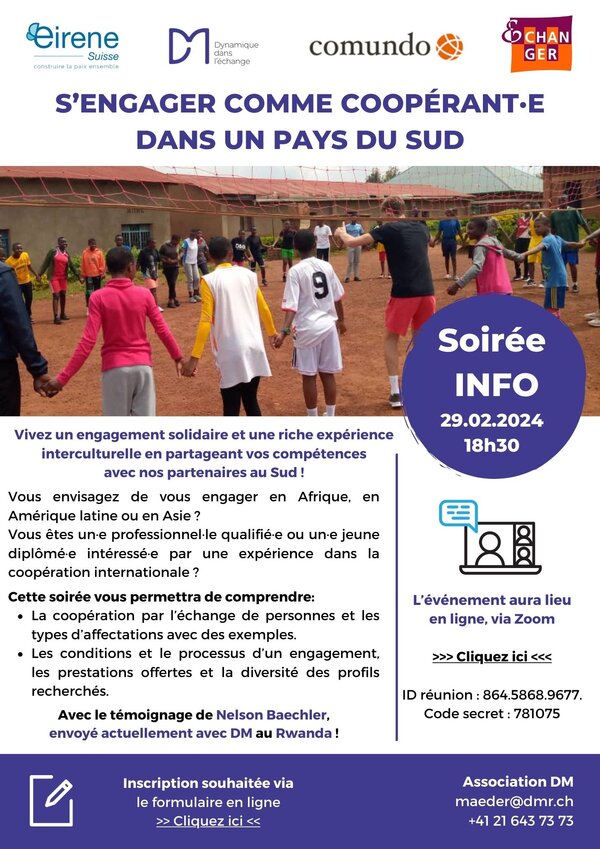 Ces séances d’info sont organisées en collaboration avec d’autres associations avec qui nous collaborons: DM, Eirene Suisse, E-CHANGER et Peace Brigades International.